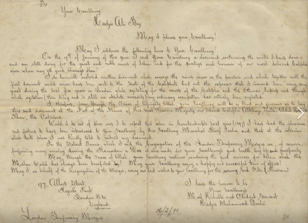 This is a letter sent by Hajj Mohammad Doul. He founded London's first masjid asking the Ottoman Caliph for funds for the work he was doing. The letter transcribed reads: